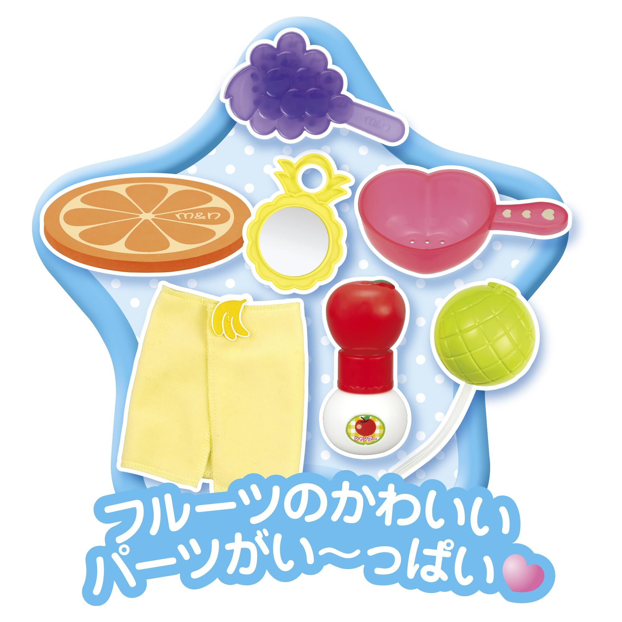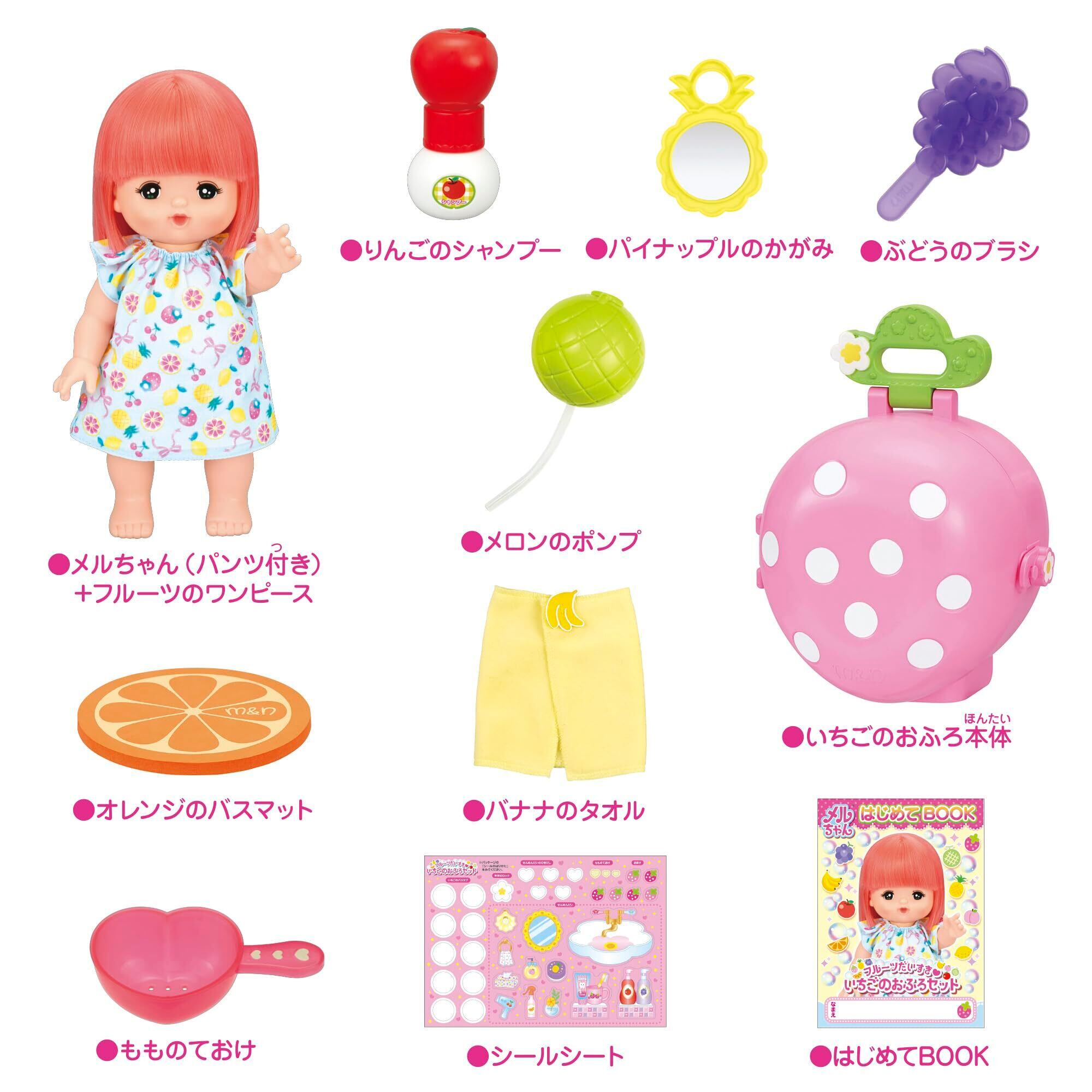 ・おふろ時間に、驚きと楽しさを感じられるメルちゃんだよ! ・対象年齢:3才以上 ・セット内容:メルちゃん(フルーツのワンピース、パンツ付き)、いちごのおふろ本体、パイナップルのかがみ、ぶどうのブラシ、りんごのシャンプー、もものておけ、メロンのポンプ、オレンジのバスマット、バナナのタオル、シールシート、はじめてブック
