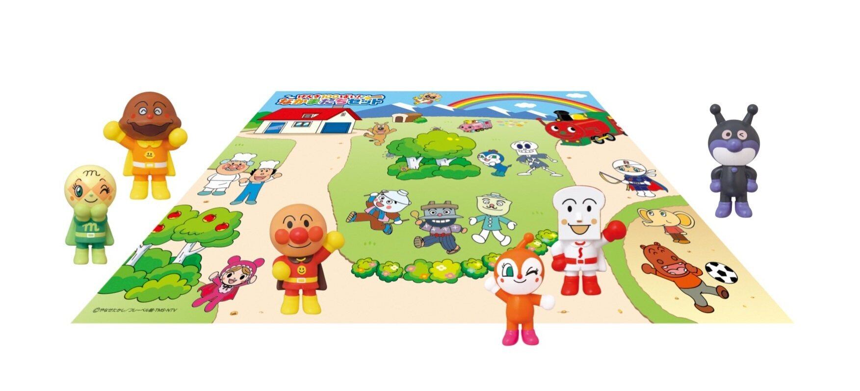 アンパンマンとなかまたちの人形6体セット。いっしょにあそべる情景シート付き。