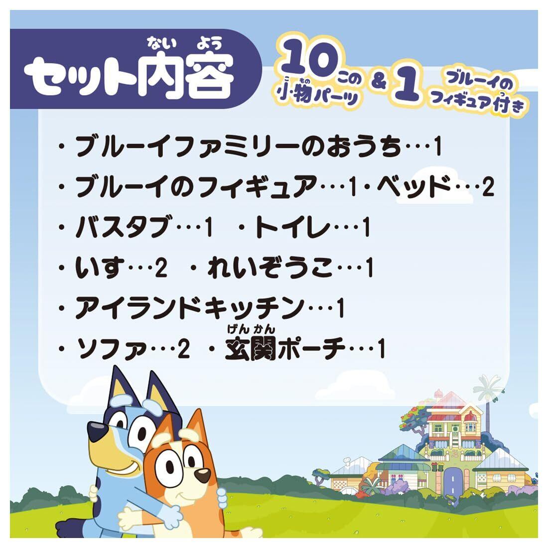 【セット内容】ブルーイファミリーのおうち本体(1),ブルーイのフィギュア(1),ベッド(2),バスタブ(1),トイレ(1),いす(2),れいぞうこ(1),アイランドキッチン(1),ソファ(2),玄関ポーチ(1),