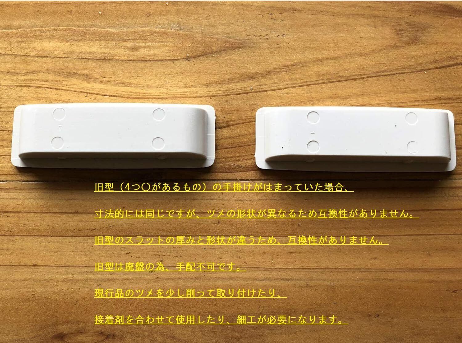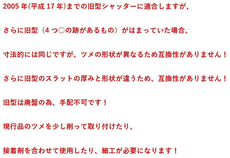 2005年(平成17年)までの旧型シャッターに適合しますが、 もっと旧型(4つ○の跡があるもの)がはまっていた場合、 寸法的には同じですが、ツメの形状が異なるため互換性がありません! 併せて旧型のスラットの厚みと形状が違うため、互換性がありません! 旧型は廃盤の為、手配不可です! 現行品のツメを少し削って取り付けたり、 接着剤を合わせて使用したり、細工が必要になります!