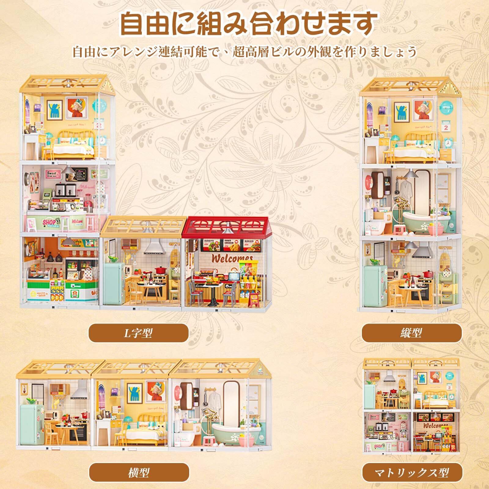 3. 自由にアレンジ連結可能なドールハウスキット: ハウス同士を縦・横に連結できるプラスチック製のミニチュアハウスキットが登場!「町シリーズ」として全7種: バスルーム、レストラン、ベッドルーム、キッチン、またコンビニエンスストア、ミルクティーショップ、ベーカリーハウス。 2つ以上の製品を組み合わせて使用することができ、豊富な観賞体験を提供します。複数のハウスクラフトキットを積み重ねて、超高層ビルの外観を作りましょう