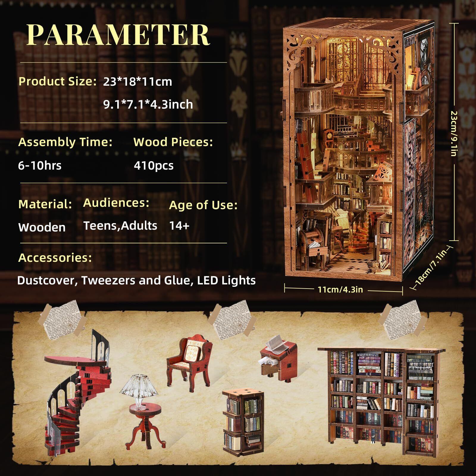【おもしろDIY体験工作木製パズル】このDIY BookNook 410+ 個のパーツが含まれており,あなた自身の組み立てを待っています。初心者の方、10代の方でも、付属の詳細マニュアルにも段階的な手順が記載されています。したがって、各ステップを簡単に完了できます。これですドールハウス キット十代の若者と14歳以上の大人に適しています。デザインにインスピレーションを与えるだけでなく、そしてそれはあなたにとって素晴らしいチャンスでもあります。家族や友達と交流しながら、ものづくりの楽しさや達成感を味わいましょう