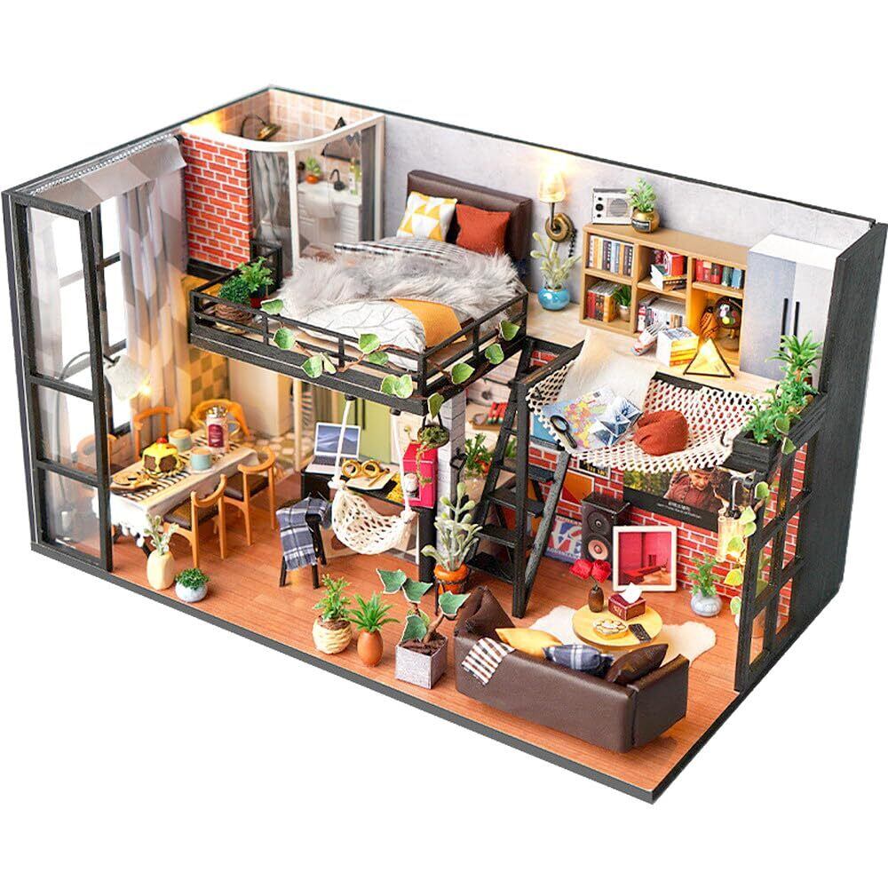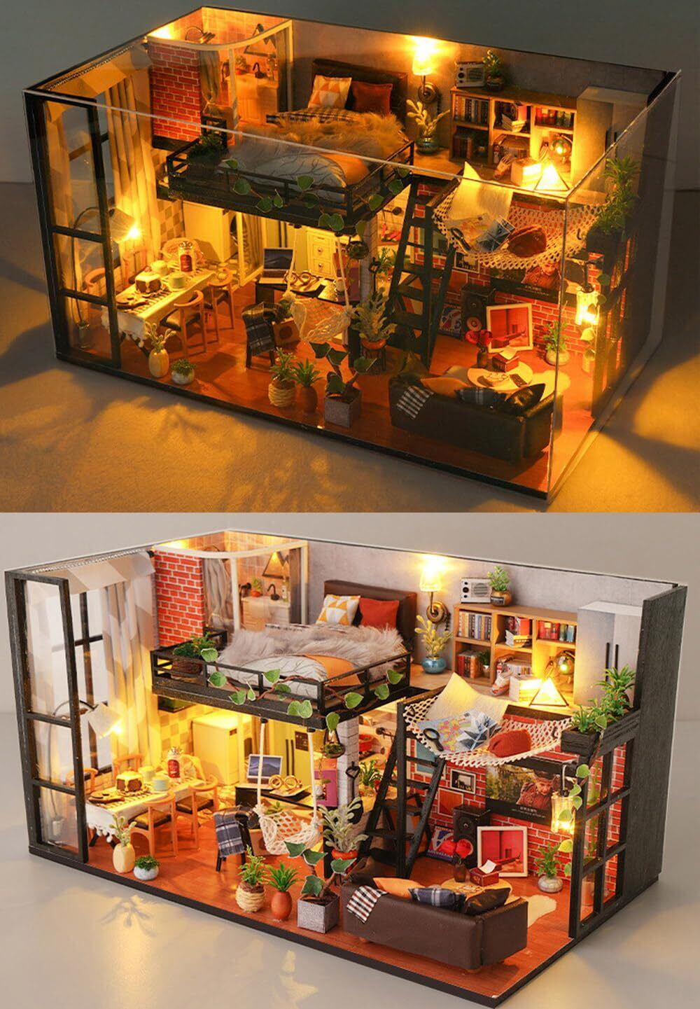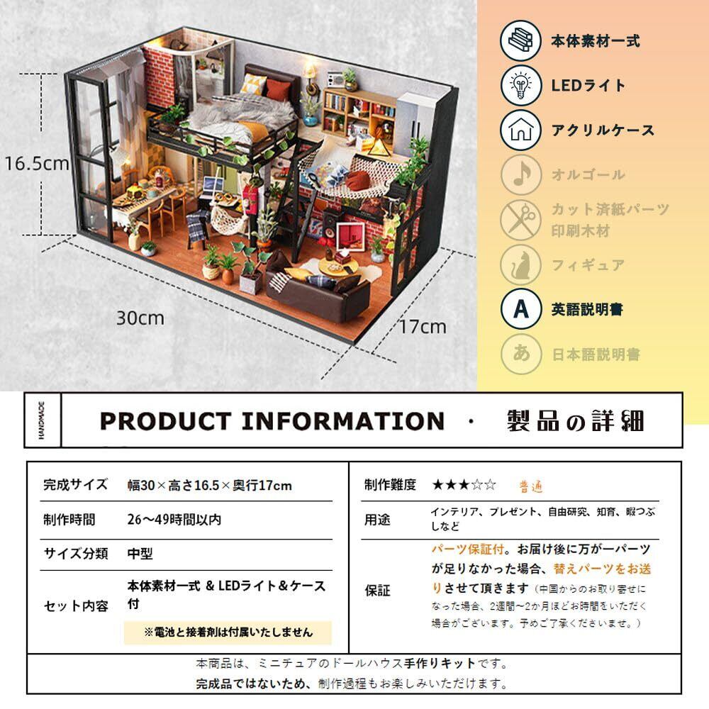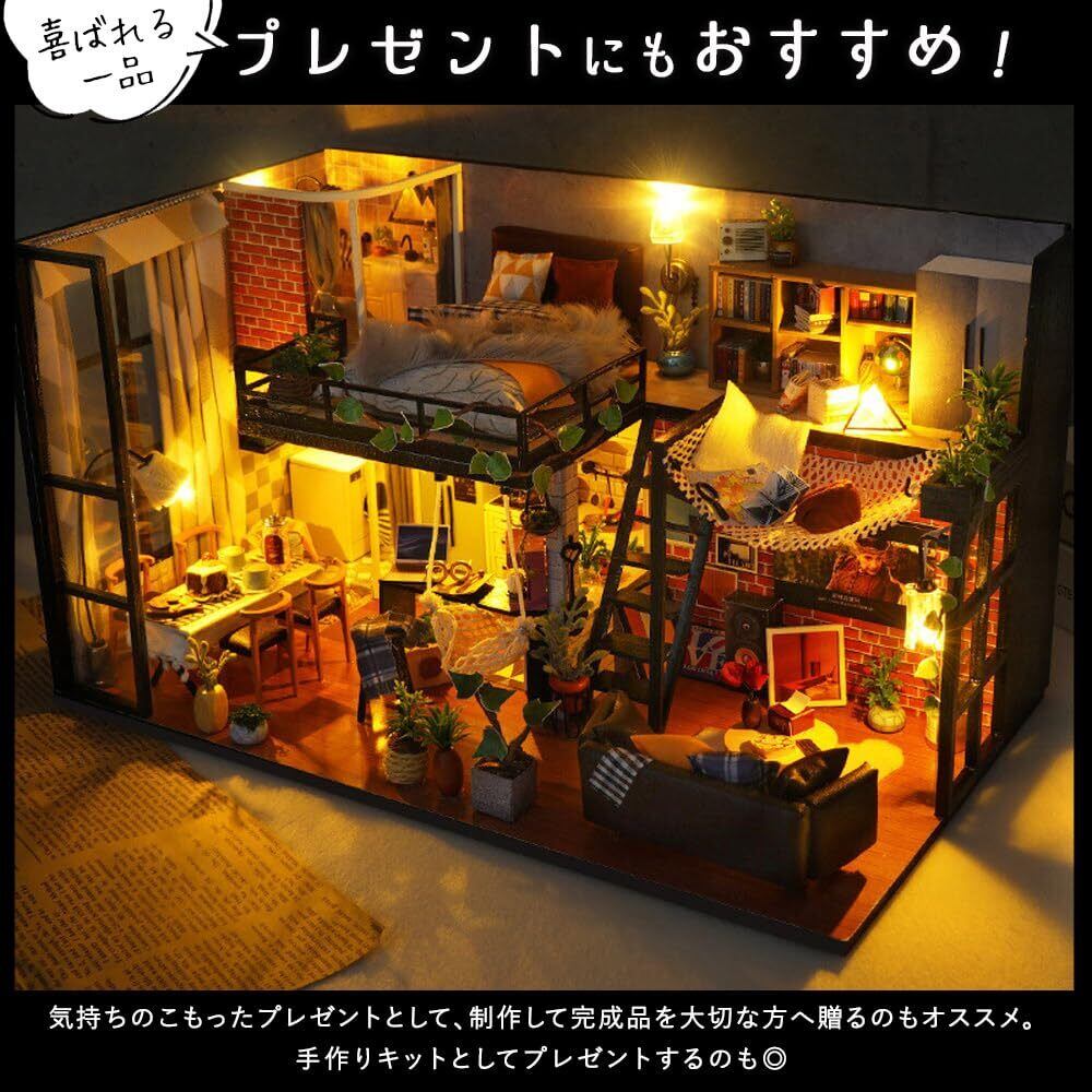 【 ヴィンテージ感が魅力の、大人のための癒し空間 】 本商品はミニチュアのドールハウスの手作りキットになります。細部までこだわったアメリカンヴィンテージ風のインテリアで、まるで映画のワンシーンのような世界を再現。クラシックなレンガ壁に、存在感のある黒いアイアン階段とロフトベッド。あたたかな照明が全体を包み込み、ノスタルジックな雰囲気を演出します。