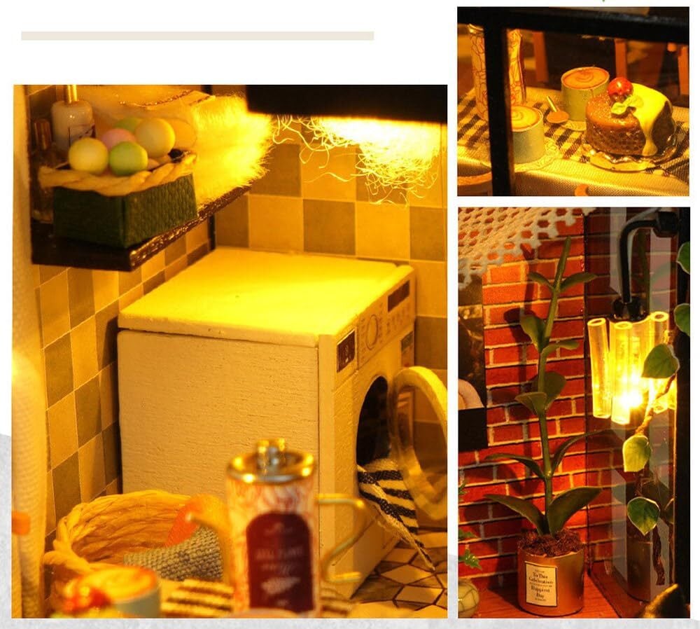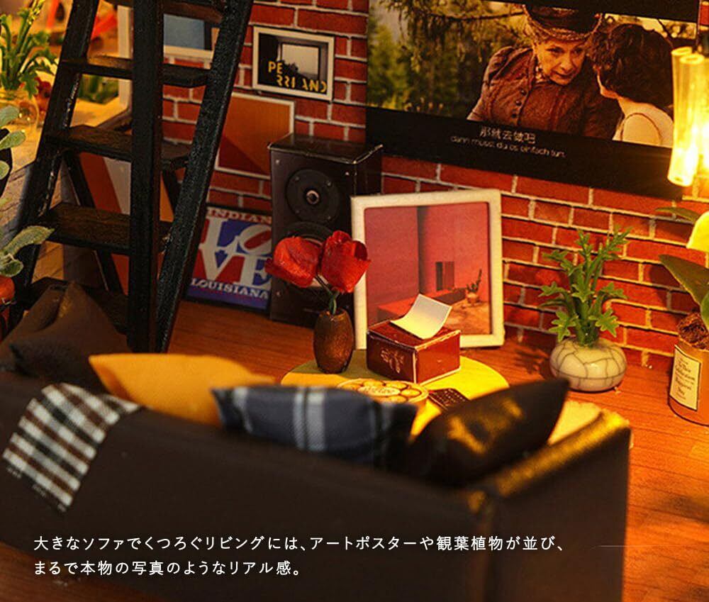 moin moin ドールハウス ミニチュア 手作りキット セット 【 英語説明書 】 1/24 スケール 二階建て アメリカン レトロ ヴィンテージ レトロ アンティーク 観葉植物 グリーン たくさん ソファ | LEDライト + アクリルケース 2505dh460