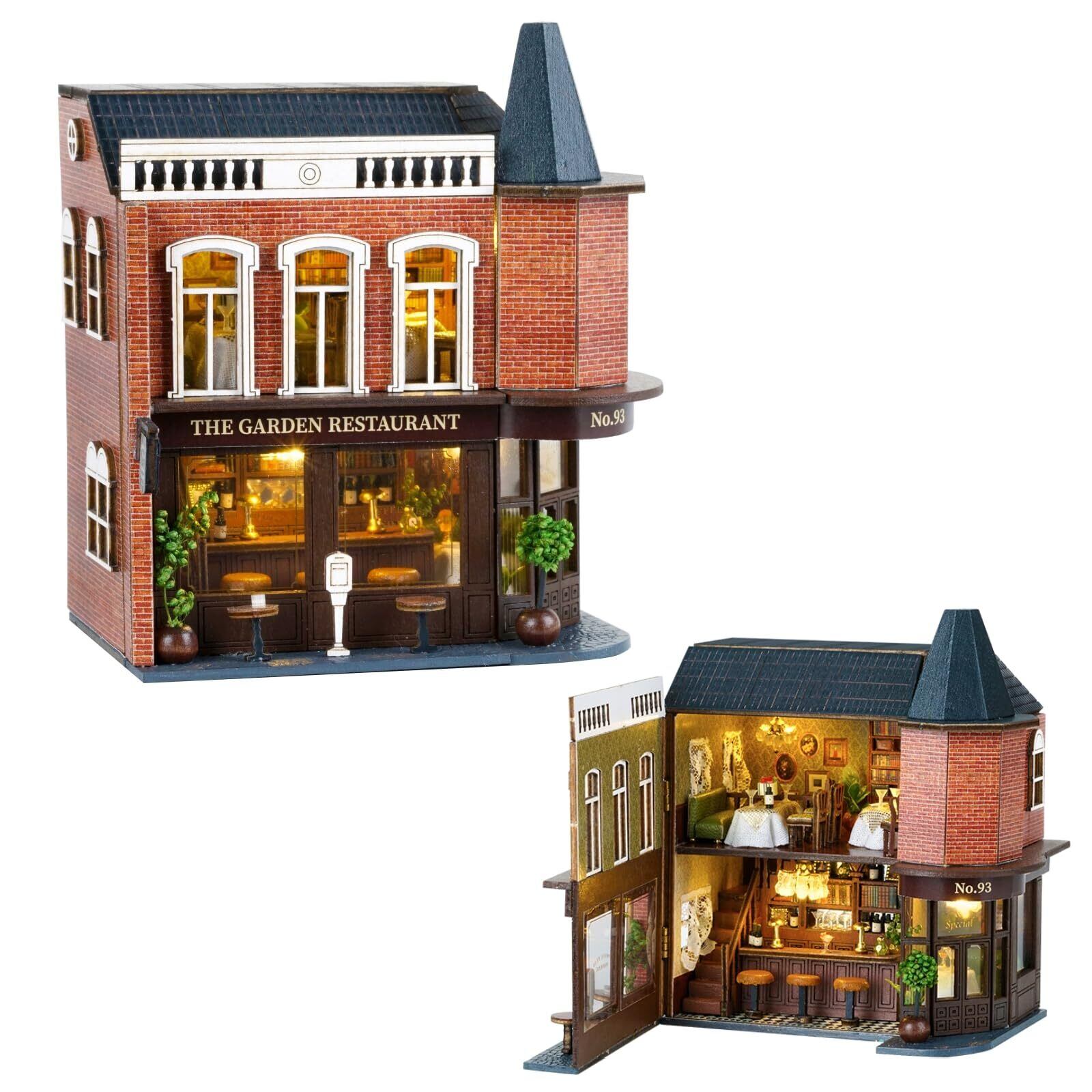【可動式ドア付きミニチュアドールハウス】 レストランのドアは開閉可能!ミニチュア人形を使ってリアルなごっこ遊びが楽しめ、子供の創造力を育む知育玩具です。