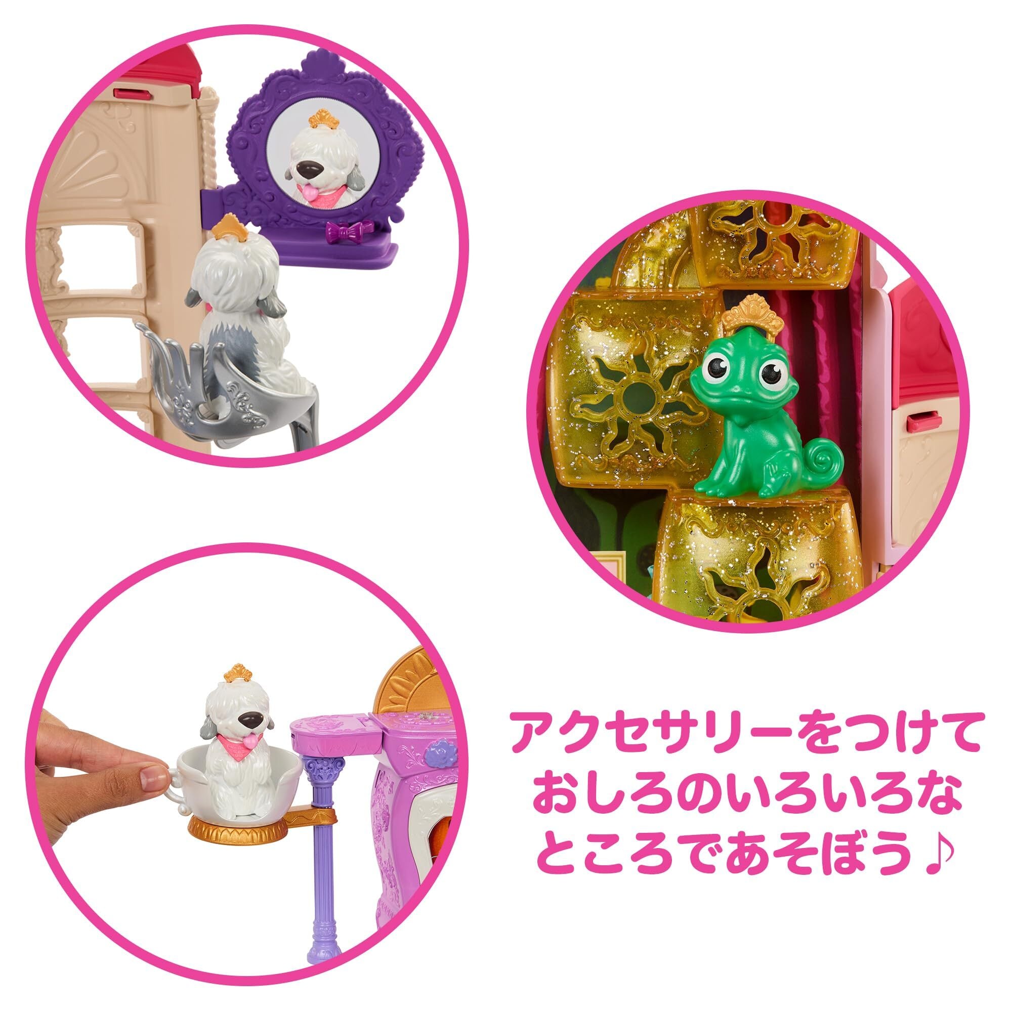 【内容】ディズニープリンセス なかまがいっぱいのおしろには、ディズニー映画に登場するプリンセスのなかまたちが集まりました!プリンセスをテーマにした7つのプレイエリアで遊べるおしろは、動物たちにとって、夢のような場所です。セットには、シンデレラのパーラ(ねずみ)、リトル・マーメイドのマックス(犬)、ラプンツェルのパスカル(カメレオン)が含まれています。さらに、20点以上の家具やアクセサリーが揃い、想像力が無限に広がります。 Disney