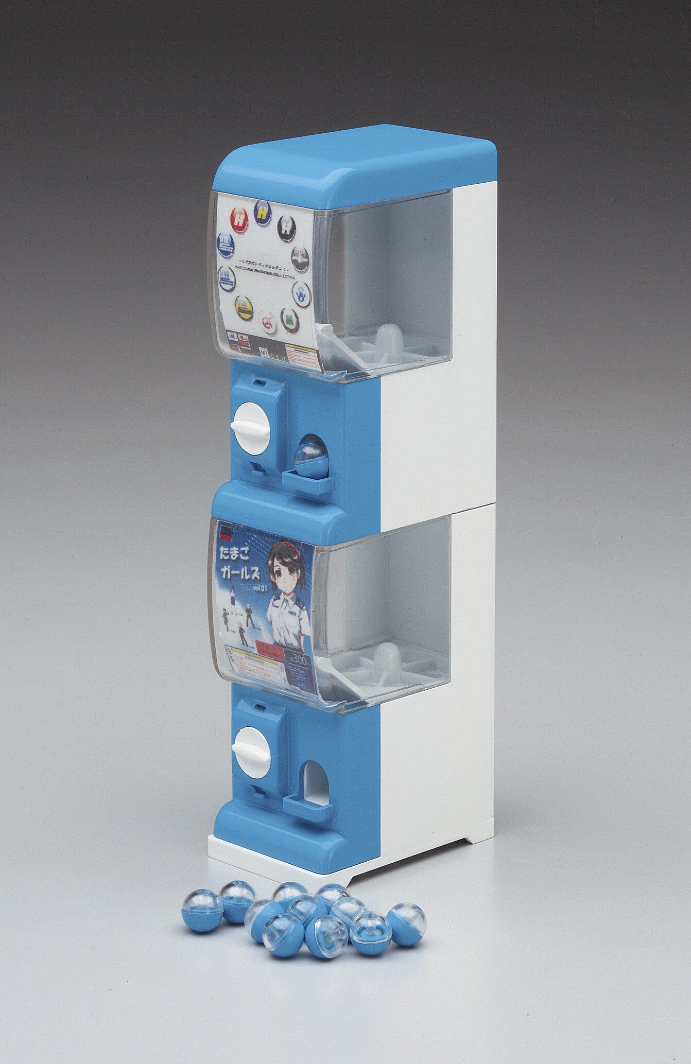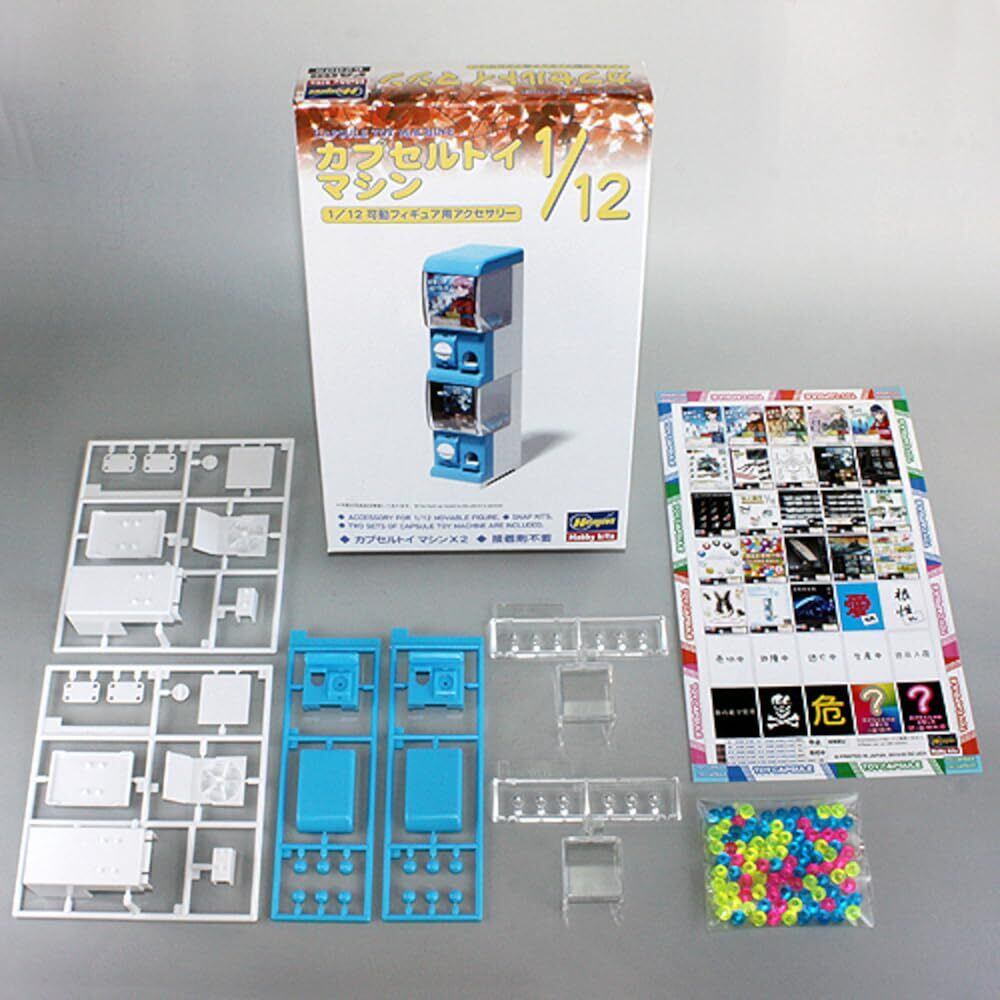カプセルトイマシン (全高:58mm) の組み立てキットが登場! カプセルトイ マシン2台と、カプセル12個のセットになります。クリアー部分全面に差し込むための、パネル (紙製) も数種付属します。成形色はライトブルー、ホワイト、クリアーの3色で、塗装しなくても雰囲気ある仕上がり。組み立ては接着剤不要。天板&床板を外すことで上下につなげたり、アタッチメントでよこにつなげる事が可能。キットを複数揃える事で、上下2段で横にずらりと並べた状態もお楽しみいただけます。