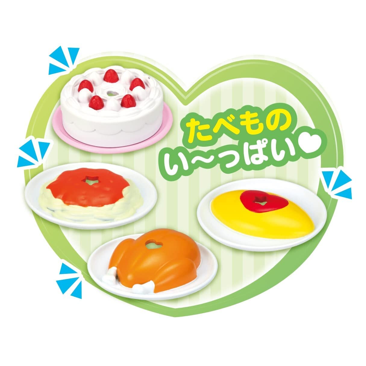 セット内容:れいぞうこ、レンジ、トイレ、せんたくき、タオル、たべものパーツ(ケーキ、パスタ、チキン、オムライス) ※お人形は含まれません。