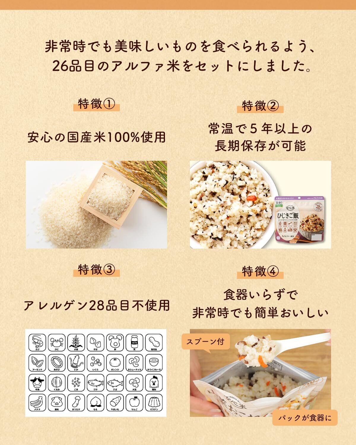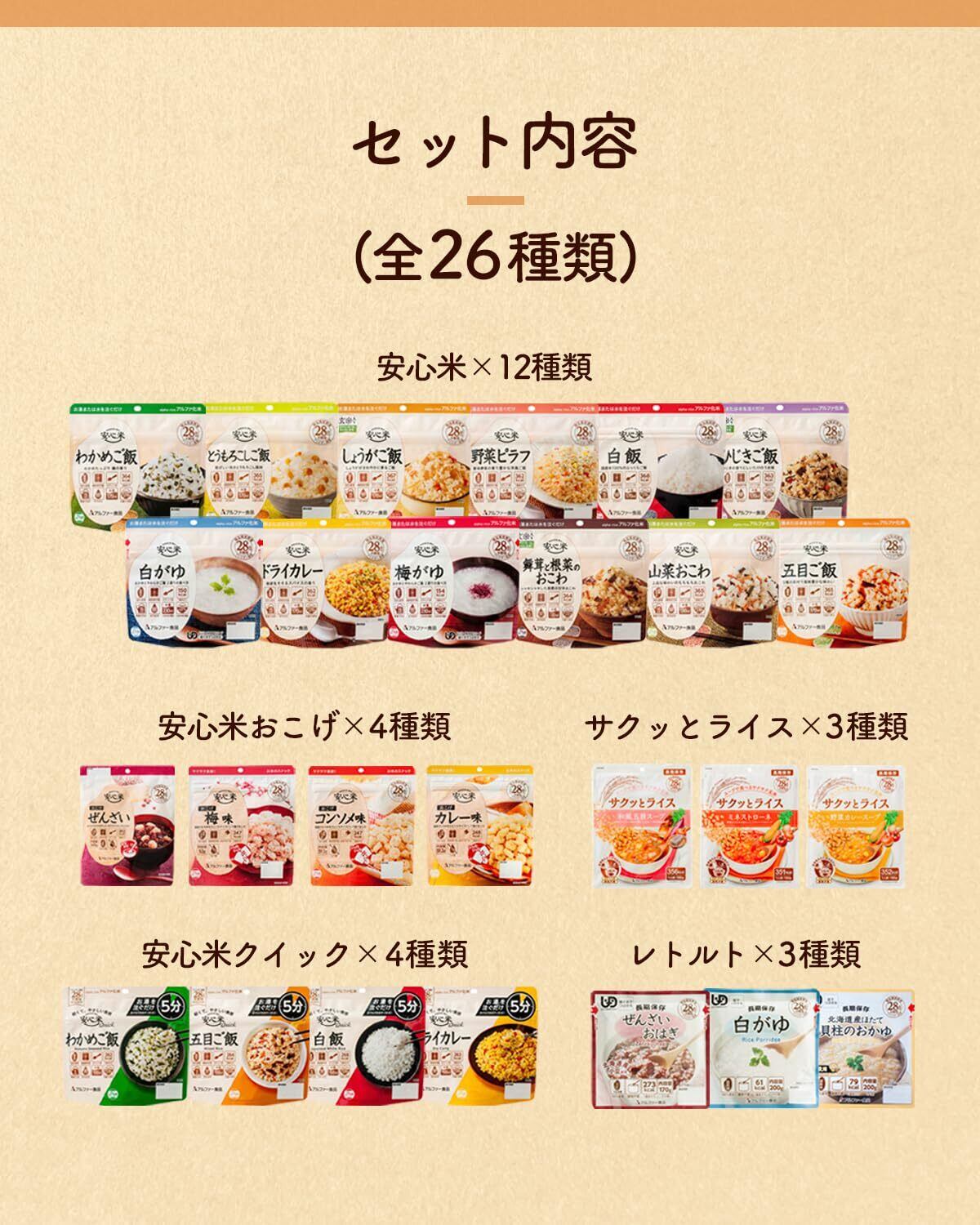 ぜひ、「アルファ米 26種8日分セット」で、あなたとご家族の安心で美味しい時間を楽しんでいただければと思います。栄養、保存性、そして多様な味わいを兼ね備えた素晴らしい一品です!