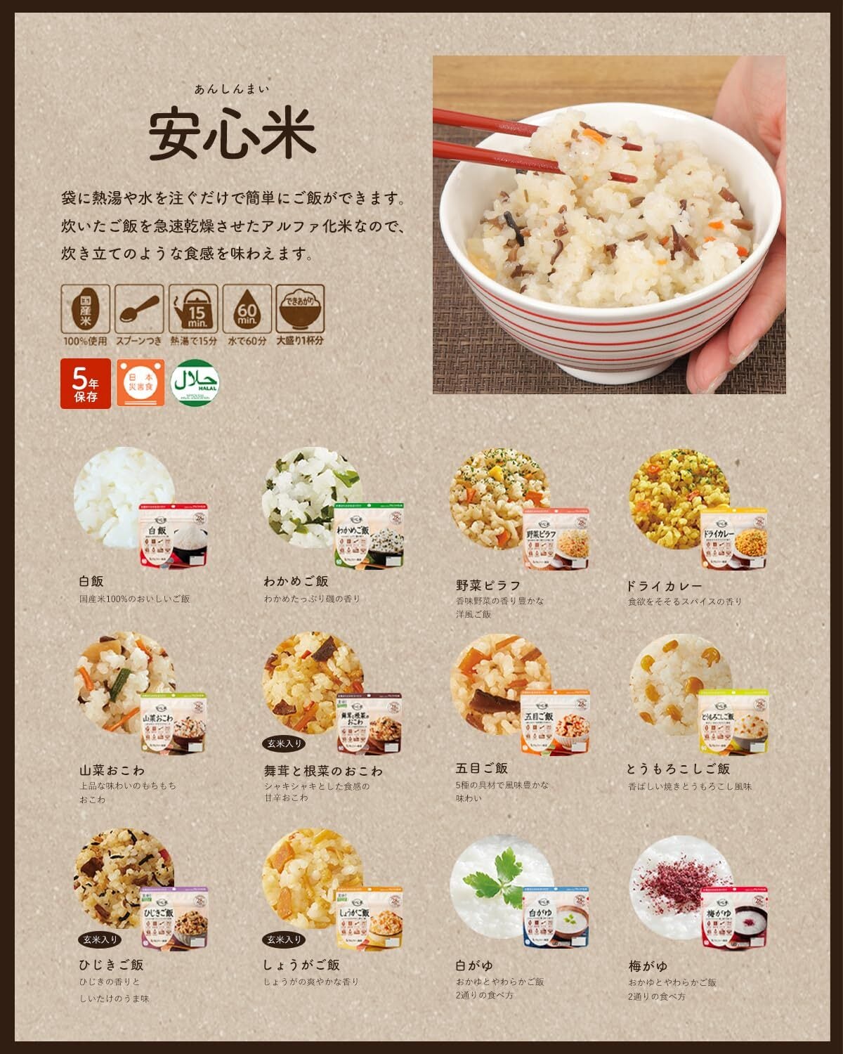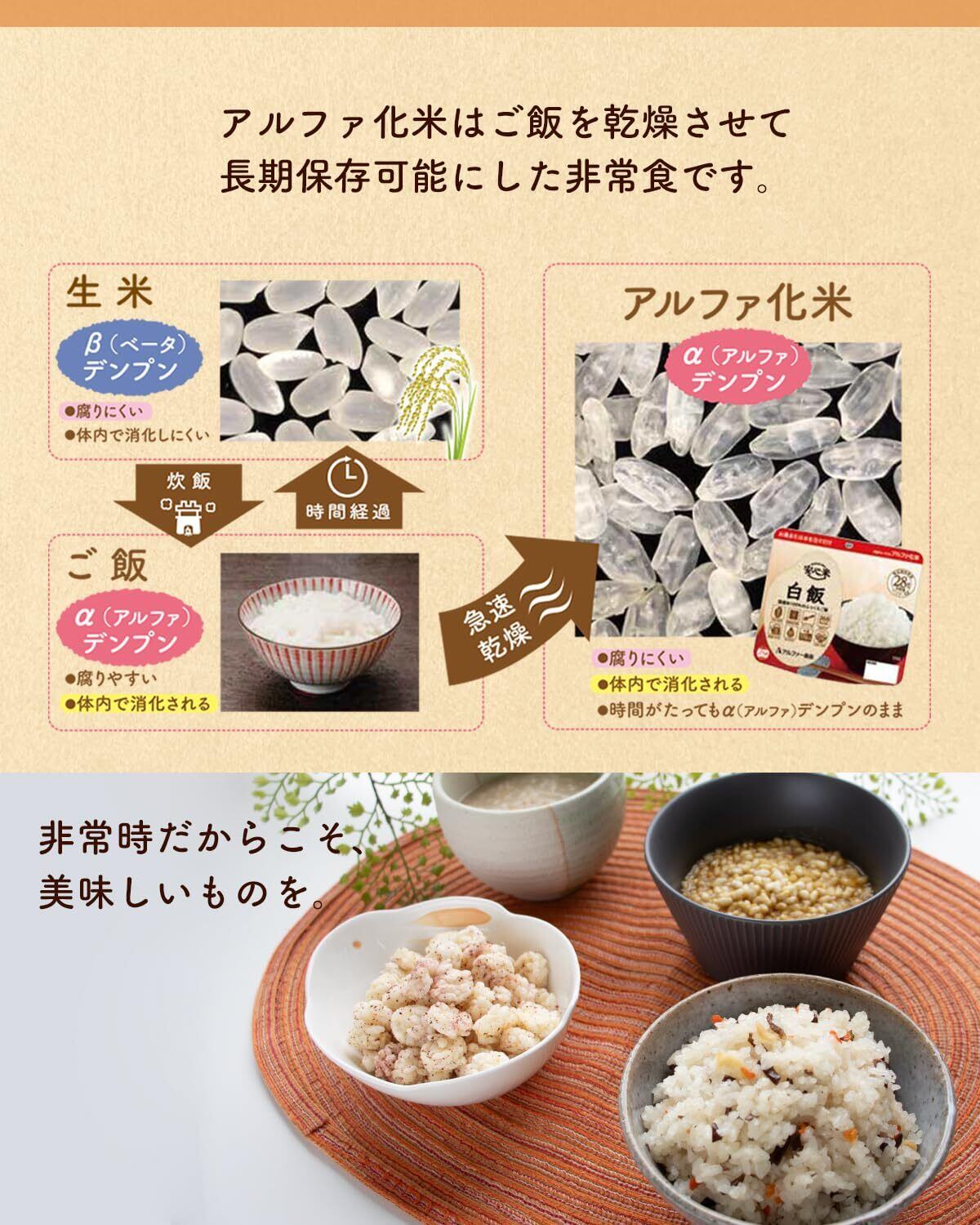 調理は簡単で、熱湯を注ぐだけであっという間に美味しいご飯が完成します。忙しい日常の中でも、手軽に栄養補給ができ、非常時やアウトドアシーンにもぴったりです。お子様やご高齢の方にも安心してお召し上がりいただける、とても便利な食品です。